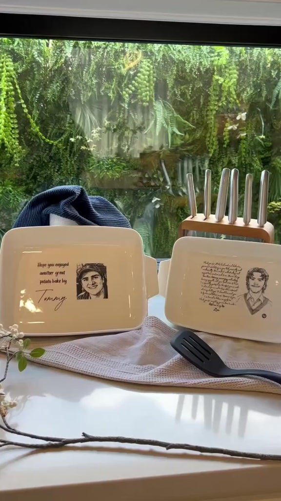 Turn a cherished handwritten recipe and a favourite photo into a lasting kitchen keepsake with our Custom Engraved Recipe & Photo White Porcelain Rectangle Pie Dish/ Baking Tray. We’ll convert your scan/photo of handwriting and portrait into engraving-ready artwork and etch it directly onto the dish. A beautiful, functional gift for weddings, housewarmings, birthdays, Mother’s/Father’s Day and Christmas.